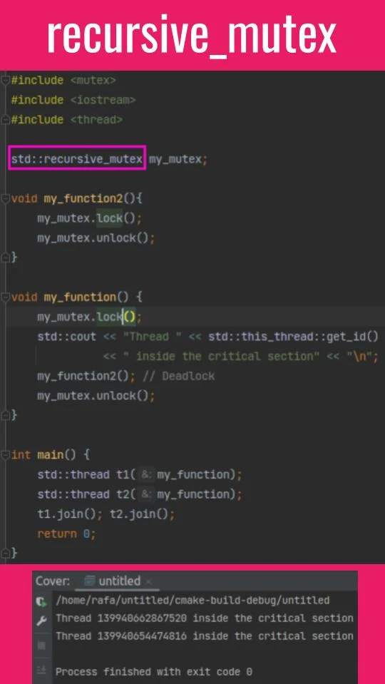 • std::recursive_mutex, on the other hand, is a recursive mutex that allows a thread to lock the mutex